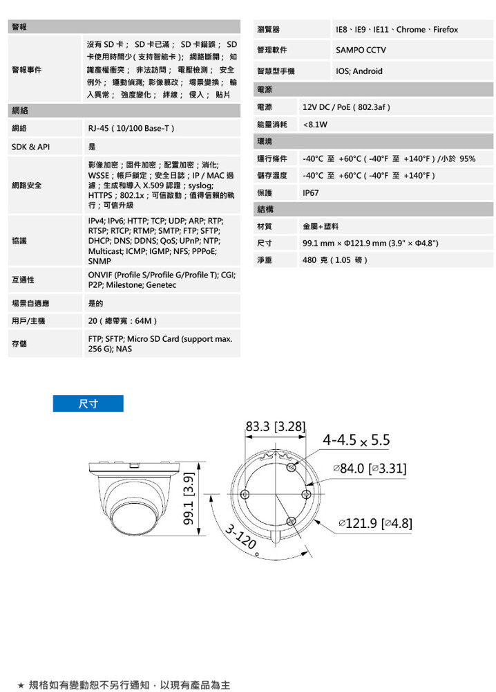 旋轉模式、WDR、3D DNR、HLC、BLC、數字水印、適用於各種監控場景