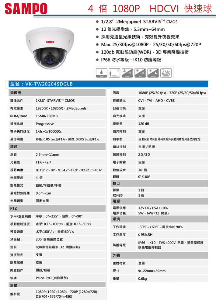1 / 2.8”STARVIS™CMOS 4倍光學變焦 最大25 / 30fps @ 1080P 最大100°/ s平移速度 支持人臉檢測 支援PoE供電 IP66,IK10 SMD 3.0 6000V防雷擊 商品需搭配監控主機才可使用