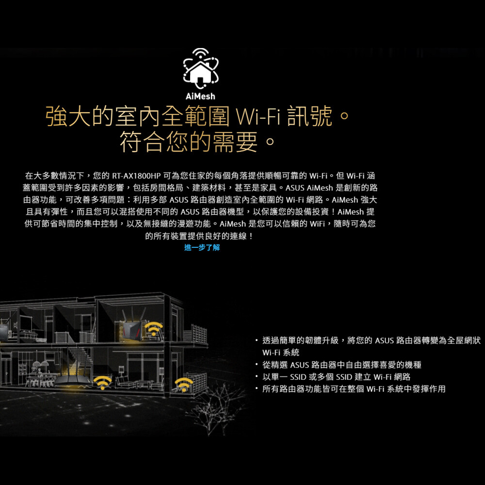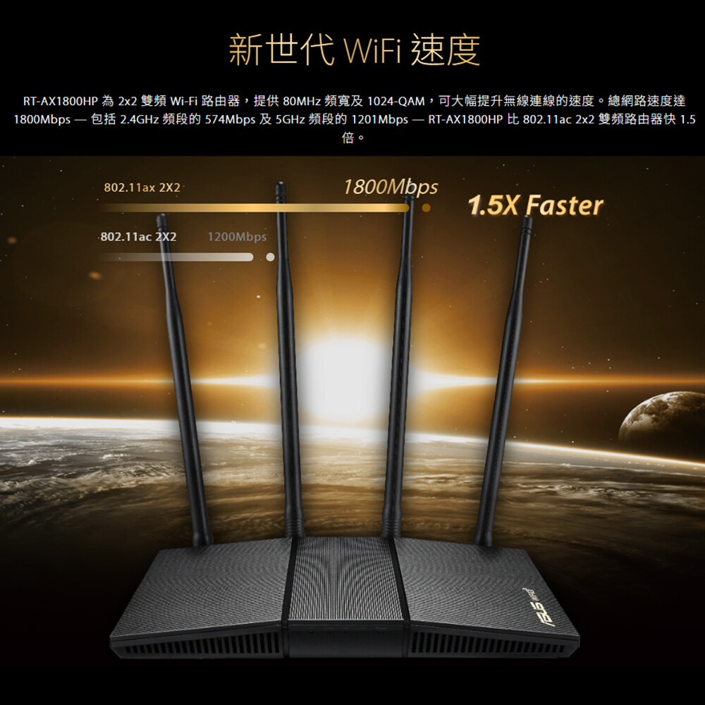 -超快Wi-Fi速度 : RT-AX1800HP支援1024-QAM以提供速度大幅提升的無線連線,總網路速度約1800Mbps,包括2.4GHz頻段的574 Mbps及5GHz頻段的1201 Mbps。