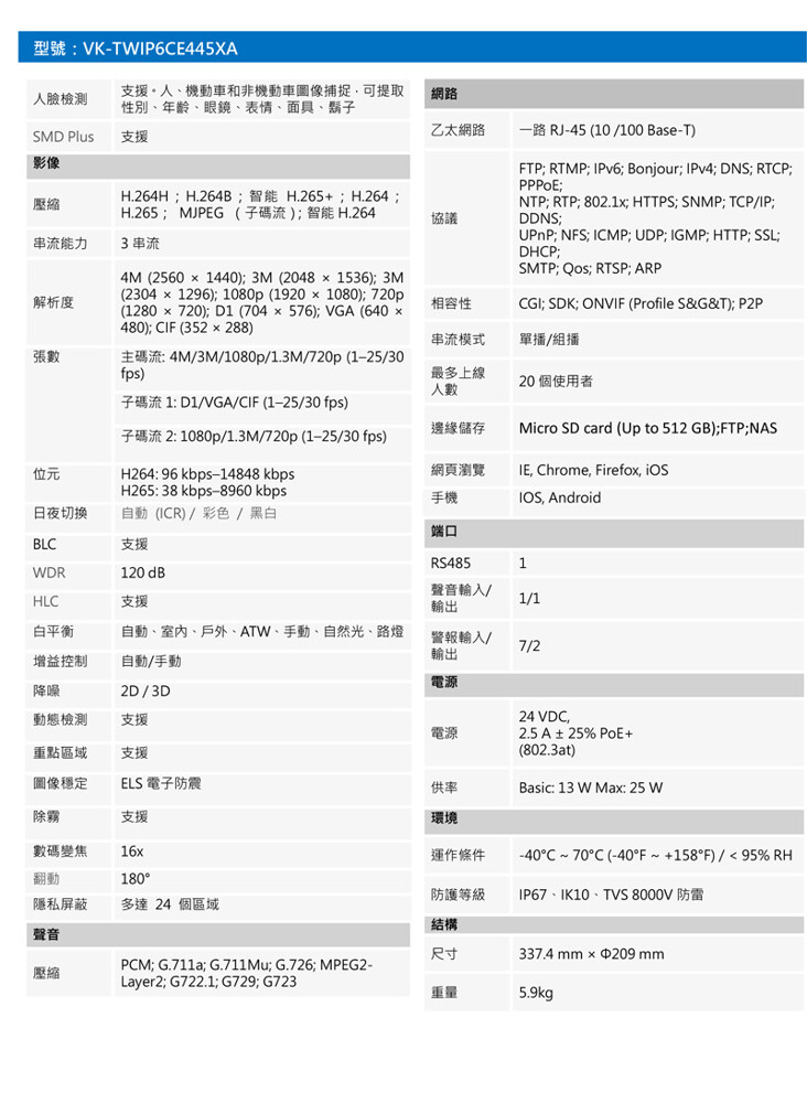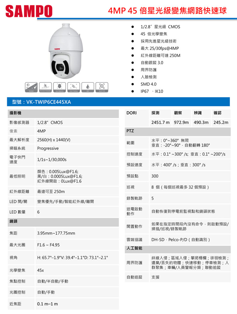 SAMPO聲寶 VK-TWIP6CE445XA AI 45倍 400萬 網路快速球攝影機 人臉偵測