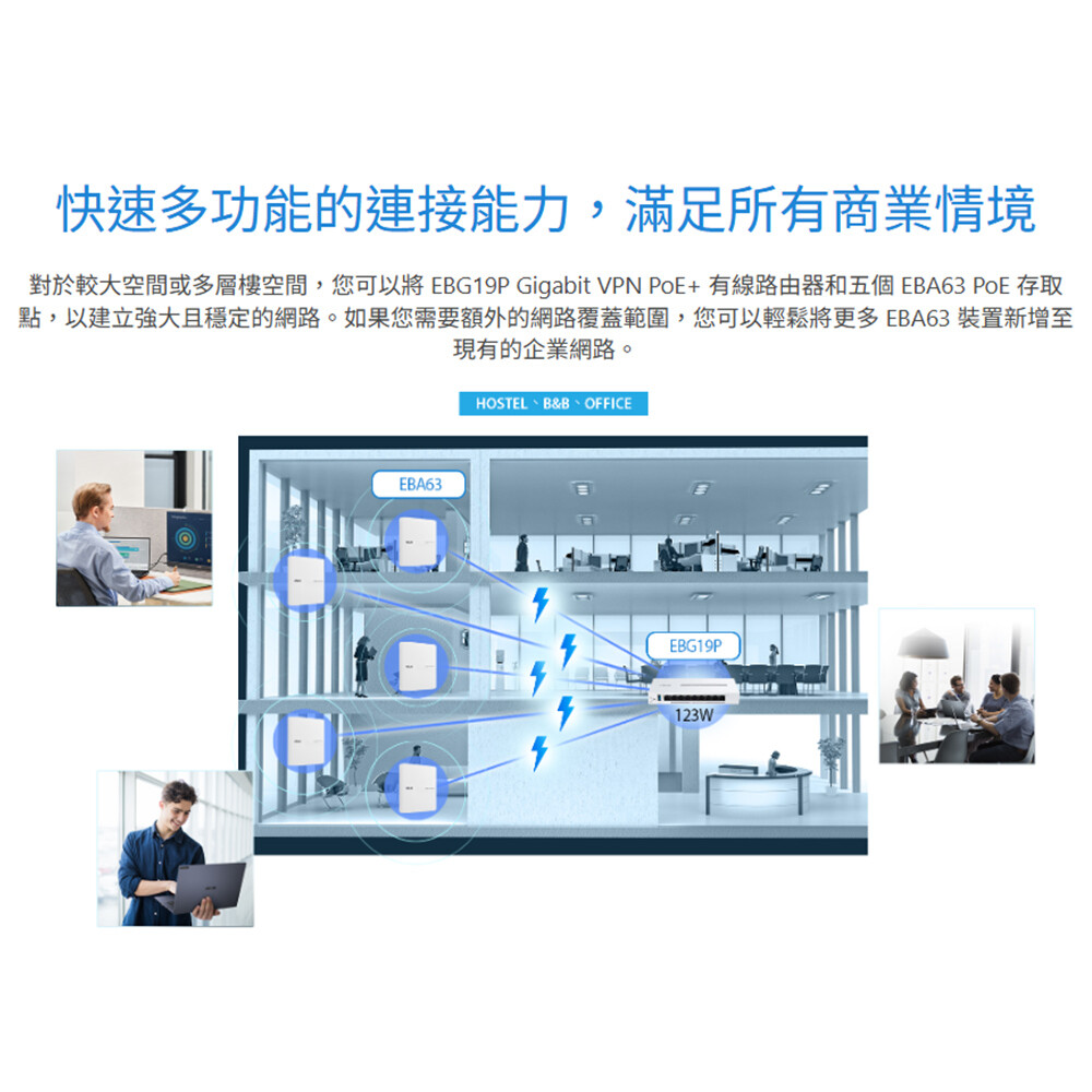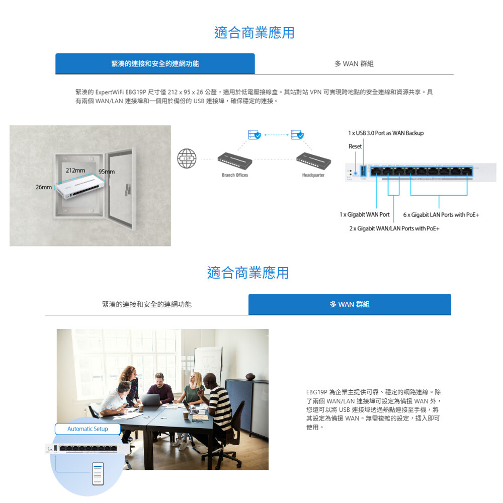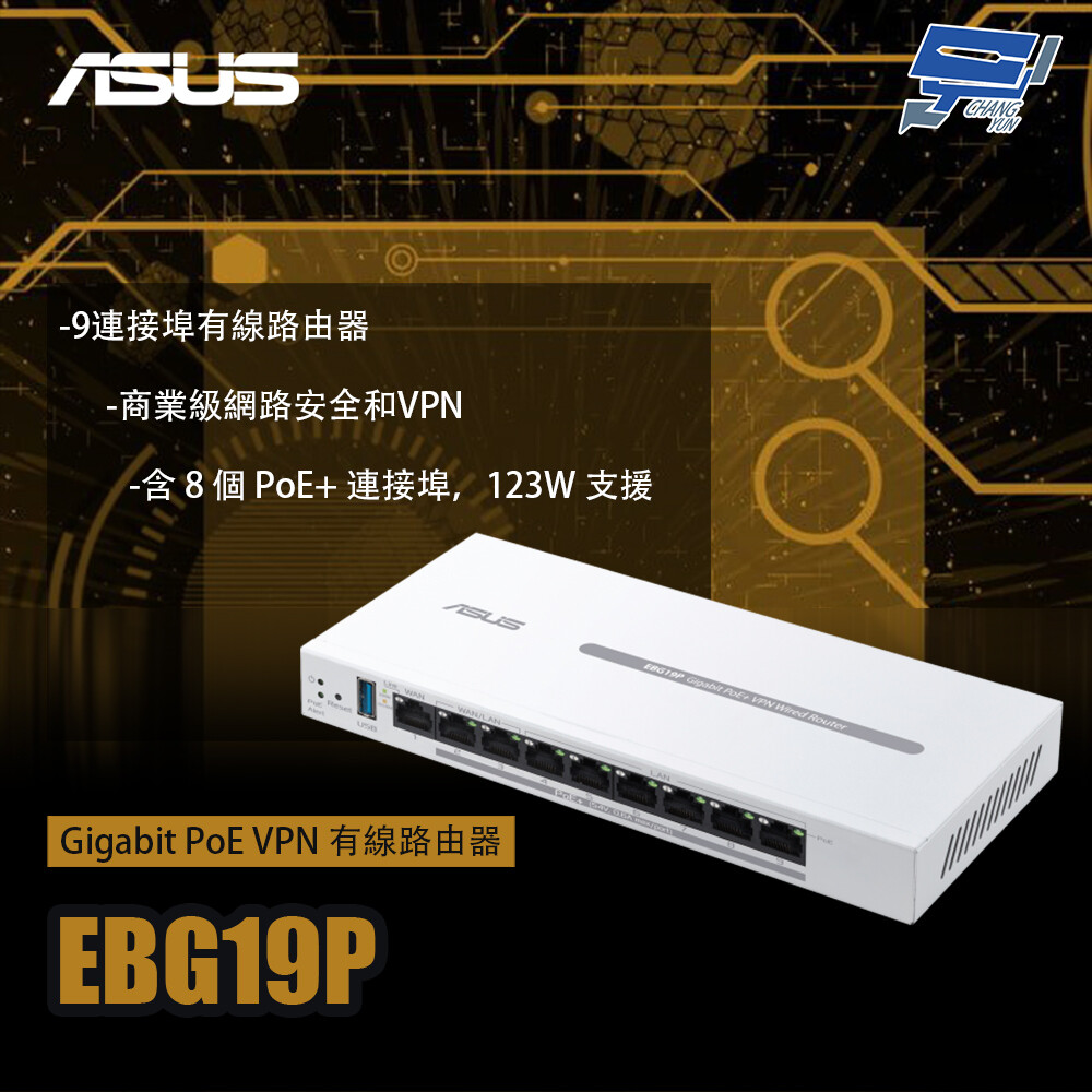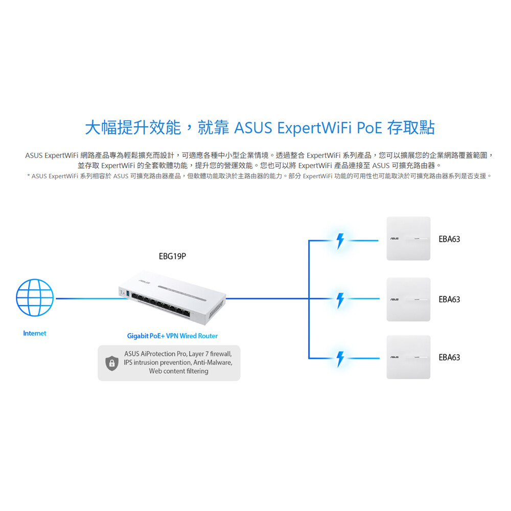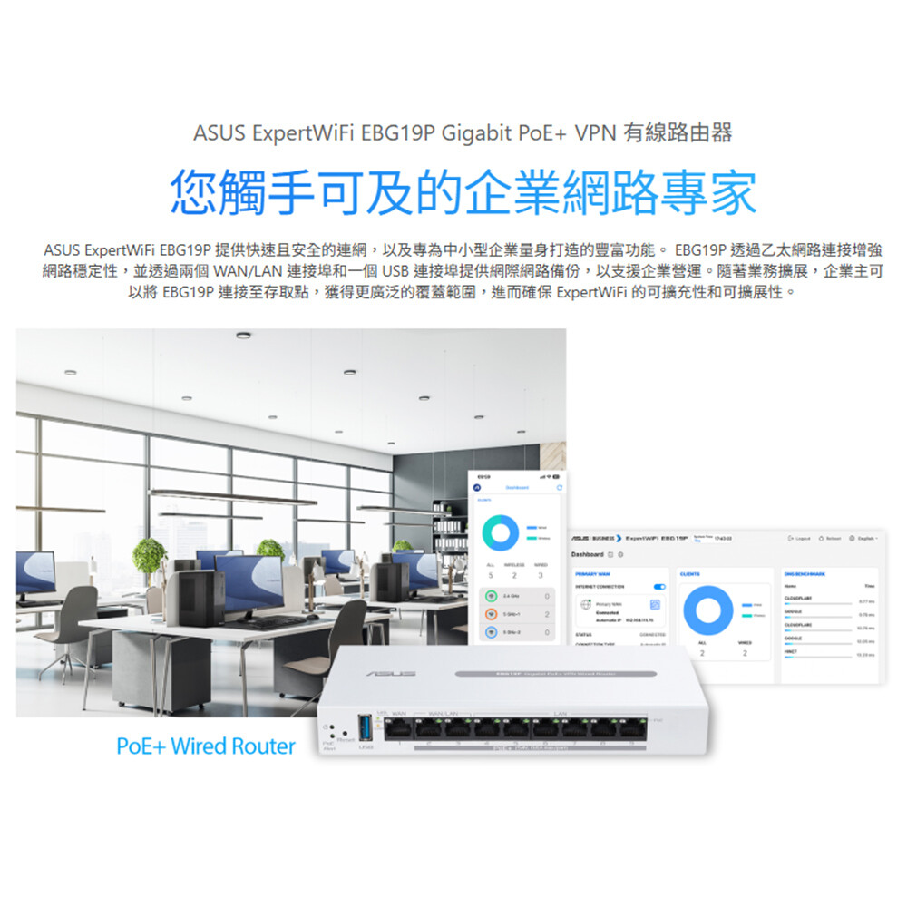 - ASUS ExpertWiFi EBG19P提供快速且安全的連網,以及專為中小型企業量身打造的豐富功能,透過乙太網路連接增強網路穩定性,並透過兩個WAN/LAN連接埠和一個USB連接埠提供網際網路備份,以支援企業營運。