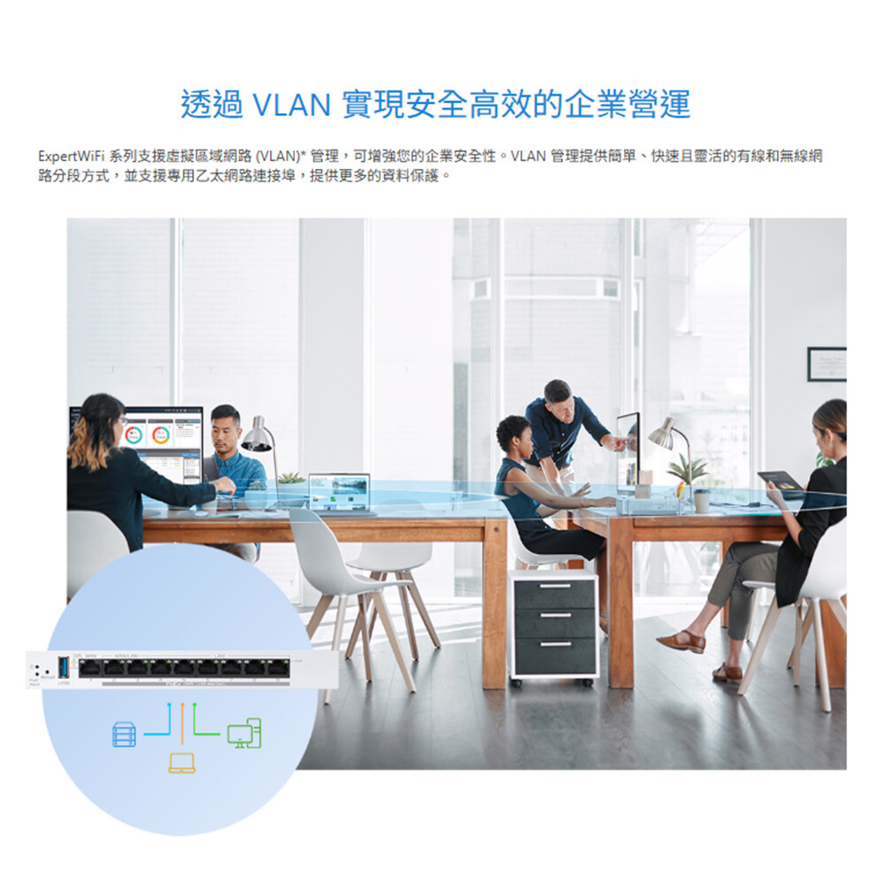 -透過VLAN實現安全高效的企業營運 : 支援虛擬區域網路(VLAN)管理,可增強您的企業安全性,VLAN管理提供簡單、快速且靈活的有線和無線網路分段方式,並支援專用乙太網路連接埠,提供更多的資料保護。