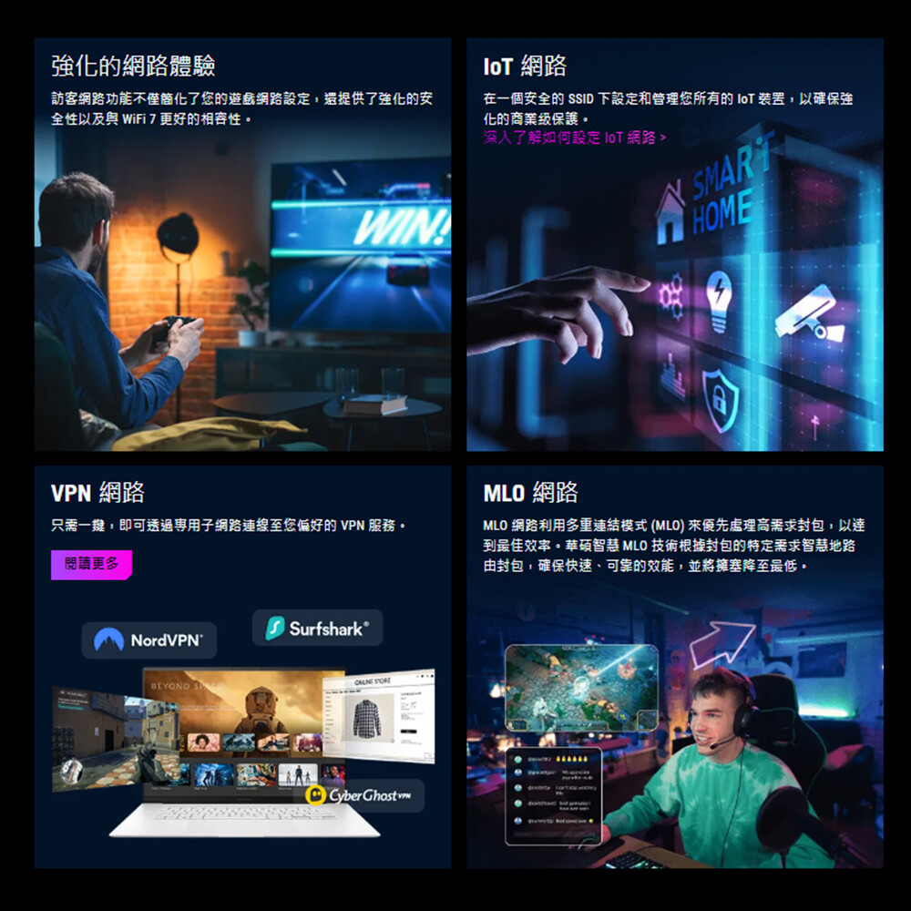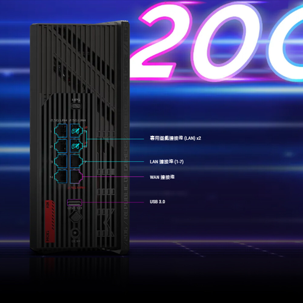 -憑藉頂尖的三頻WiFi 7和4x4 MIMO技術,提供高達18,000Mbps的閃電般疾速,加上總計20G的有線傳輸容量,確保您在所有平台上都能享受無縫、低延遲的遊戲體驗,ROG獨家的遊戲網路(Gaming Network)更帶來創新的一鍵SSID 遊戲加速功能,而三段式網路安全機制則能保護您的連網世界,同時簡化操作。
