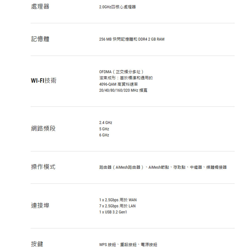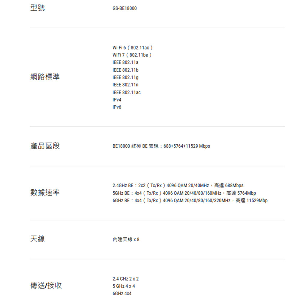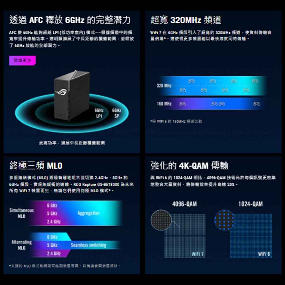 -強化的4K-QAM傳輸 : 與WiFi 6的1024-QAM相比,4096-QAM技術允許每個訊號更密集地整合大量資料,將傳輸效率提升高達20%。