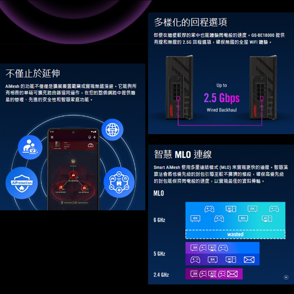 -終極三頻MLO : 多重連結模式(MLO)透過智慧地組合並切換2.4GHz、5GHz和 6GHz頻段,實現無緩衝的連線,ROG Rapture GS-BE18000為未來所有WiFi 7 裝置而生,無論它們使用何種MLO模式。