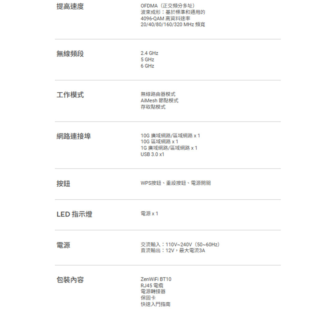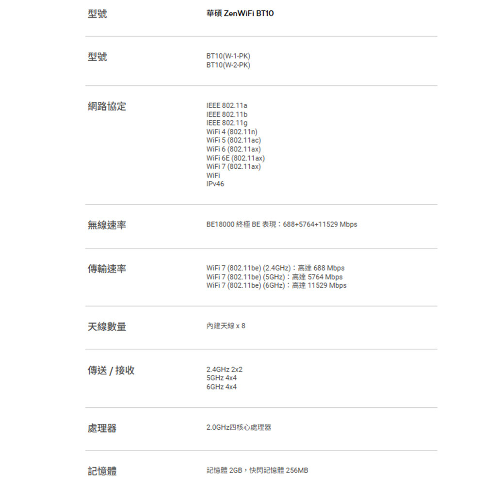 -三頻WiFi 7(802.11be) Smart AiMesh可擴充Mesh系統,6 GHz WiFi,總體網速可達18 Gbps,覆蓋範圍達170坪(雙入),雙10G連接埠,物聯網裝置和家長控管功能專用的Smart Home Master SSID,進階網路安全性和VPN。