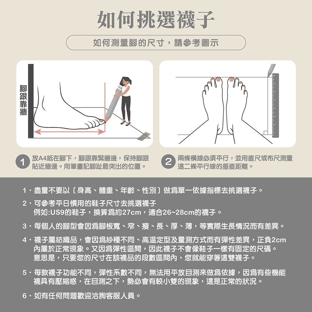 │襪子會因使用者腳型的寬、胖瘦、長等,且拍照模特兒所展示襪子皆為示意圖,實際穿起來的感受與視覺效果不同。