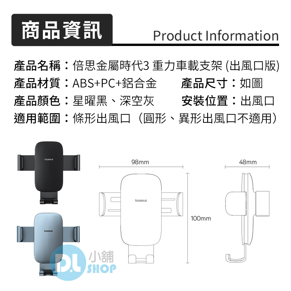 產品名稱:倍思金屬時代3 重力車載手機支架 (出風口版)