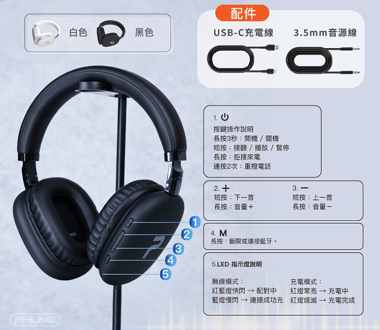 .內容物:耳機x1、USB-C充電線x1、3.5mm音源線x1