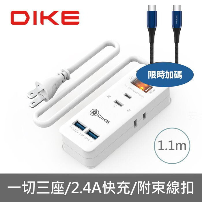 DIKE【DAH423WT-COOL】安全加強型一切三座雙USB電源延長線DAH423WT排插