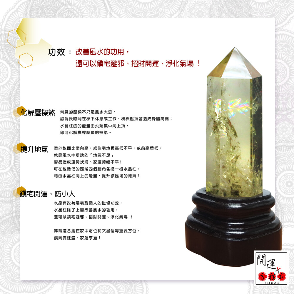 水晶柱用法;化解壓樑煞/常見的壓樑不只是風水大忌,認為長時間在樑下休息或工作,橫樑壓頂會造成身體病痛;也可以用科學角度來分析,樑的形狀容易產生壓迫感,讓潛意識中容易產生不安,進而影響到人的精神系統、睡眠品質,水晶柱的的能量由尖端集中向上頂,即可化解橫樑壓頂的煞氣