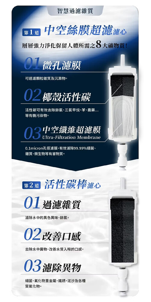 2分L型插栓*1,膨脹管*4,3分PE管4m(白色)*1,中空絲膜超濾濾芯*1,活性碳棒濾芯*1(濾芯安裝於機體內),說明書(含保證書)*1