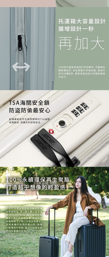 旅行箱是長途旅行的好夥伴,可擴增拉鍊裝置設計,自由調整行李箱容量。箱底的把手凹槽設計,甚麼角度抬起行李箱都穩固又省力。