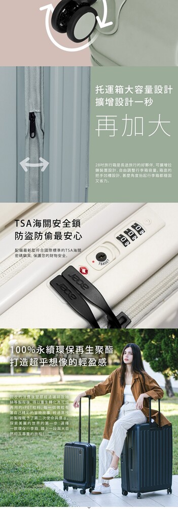 旅行箱是長途旅行的好夥伴,可擴增拉鍊裝置設計,自由調整行李箱容量。箱底的把手凹槽設計,甚麼角度抬起行李箱都穩固又省力。