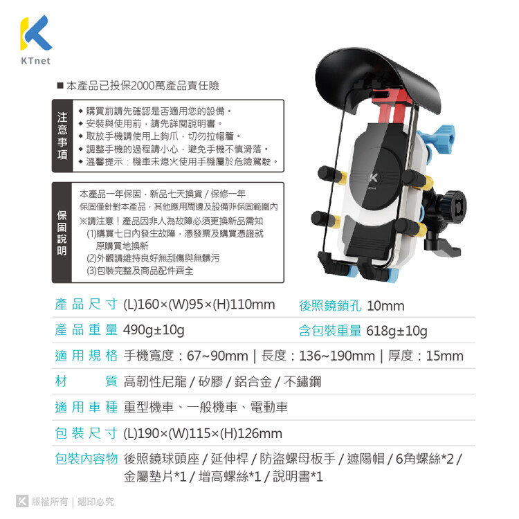 內容物:後照鏡球頭座/延伸桿/防盜螺母板手/遮陽帽 /6角螺絲*2/ 金屬墊片*1/增高螺絲*1/說明書*1