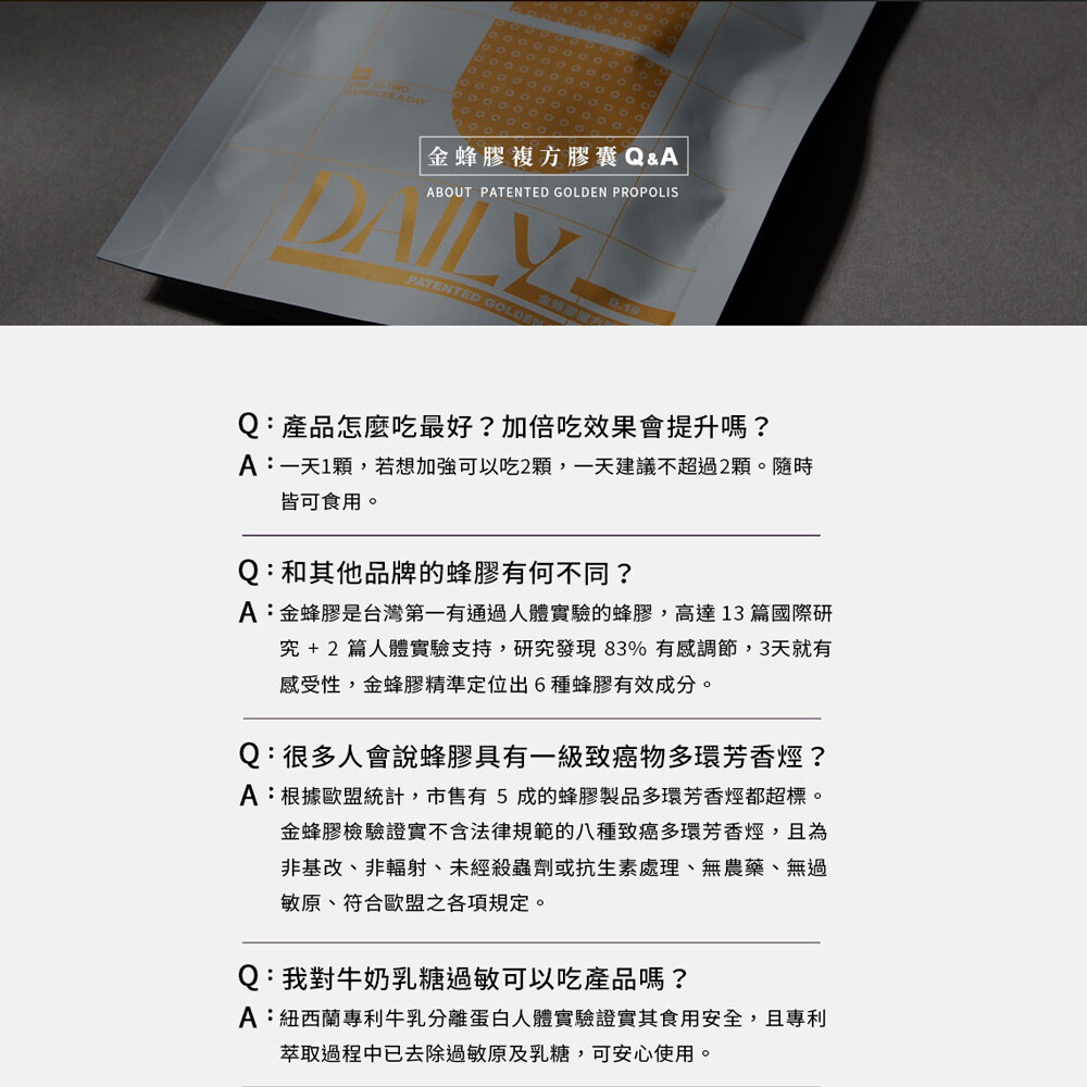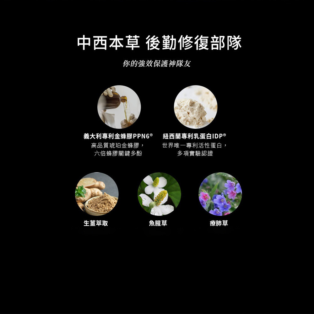 【商品成分】蜂膠萃取物(阿拉伯膠、蜂膠萃取物、蔗糖、二氧化矽)、硬脂酸鎂、難消化麥芽糊精、紐西蘭專利牛乳分離蛋白、療肺草萃取物(療肺草萃取物、麥芽糊精)、魚腥草萃取物(魚腥草萃取物、麥芽糊精)、生薑萃取物(生薑萃取物、麥芽糊精)