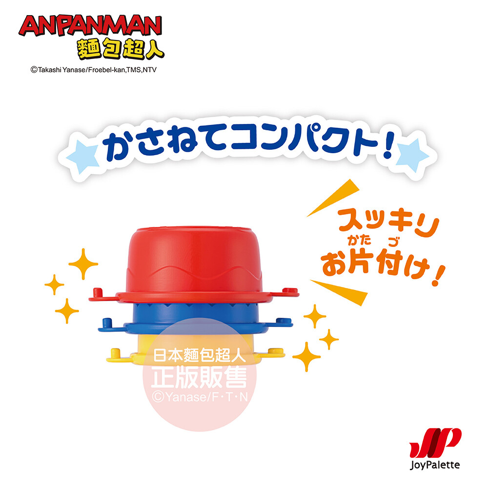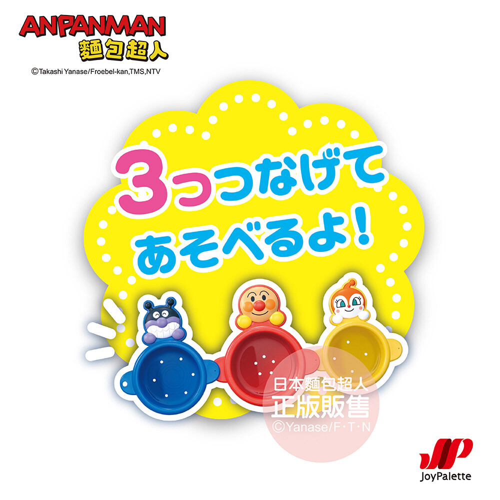 內含3種造型疊疊杯(麵包超人、細菌人、紅精靈),可連接起來,