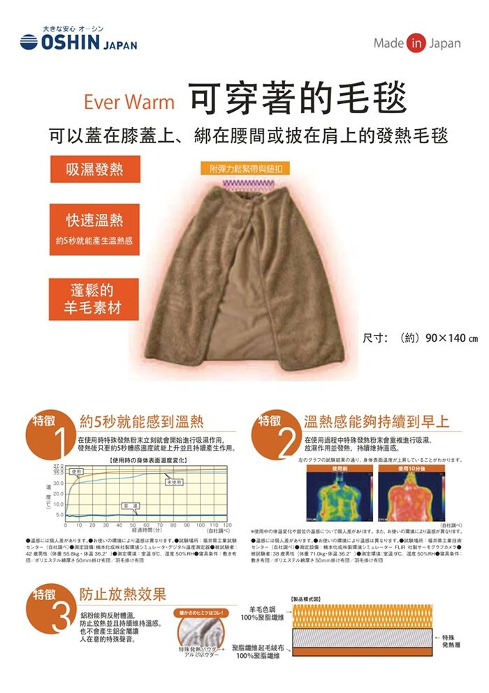 ◆ 可以蓋在膝蓋上 綁在腰間或披在肩上的發熱毛毯