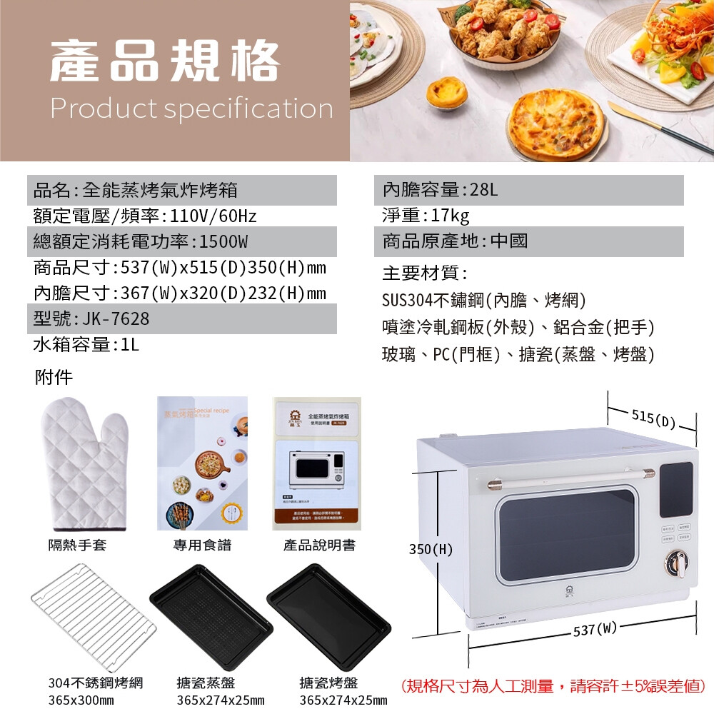 【晶工牌】 28L全能蒸烤氣炸烤箱 JK-7628