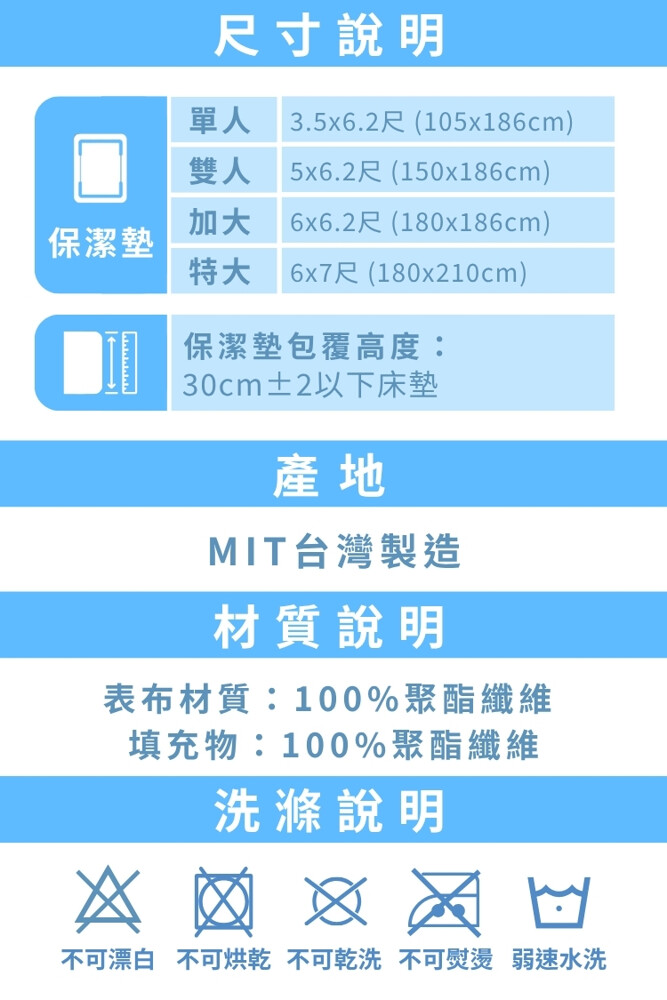 內層使用高品質強力吸水鋪棉層,床包式保潔墊,具防抗菌