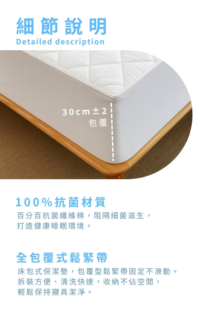 內層使用高品質強力吸水鋪棉層,床包式保潔墊,具防抗菌