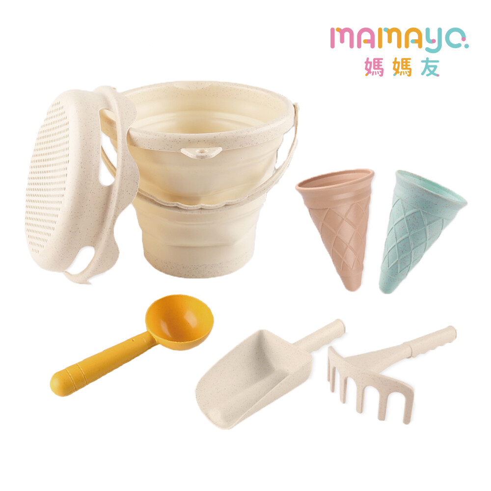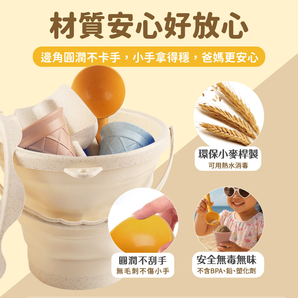 組合內含挖勺一件,砂鏟一件,小抓耙一件,甜筒兩件,摺疊水桶一件,水桶收納盤一件(可收納水桶或單獨做盤子使用)。