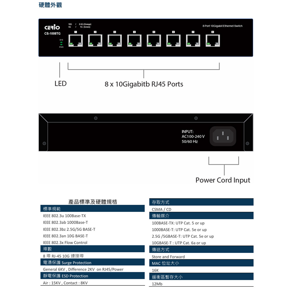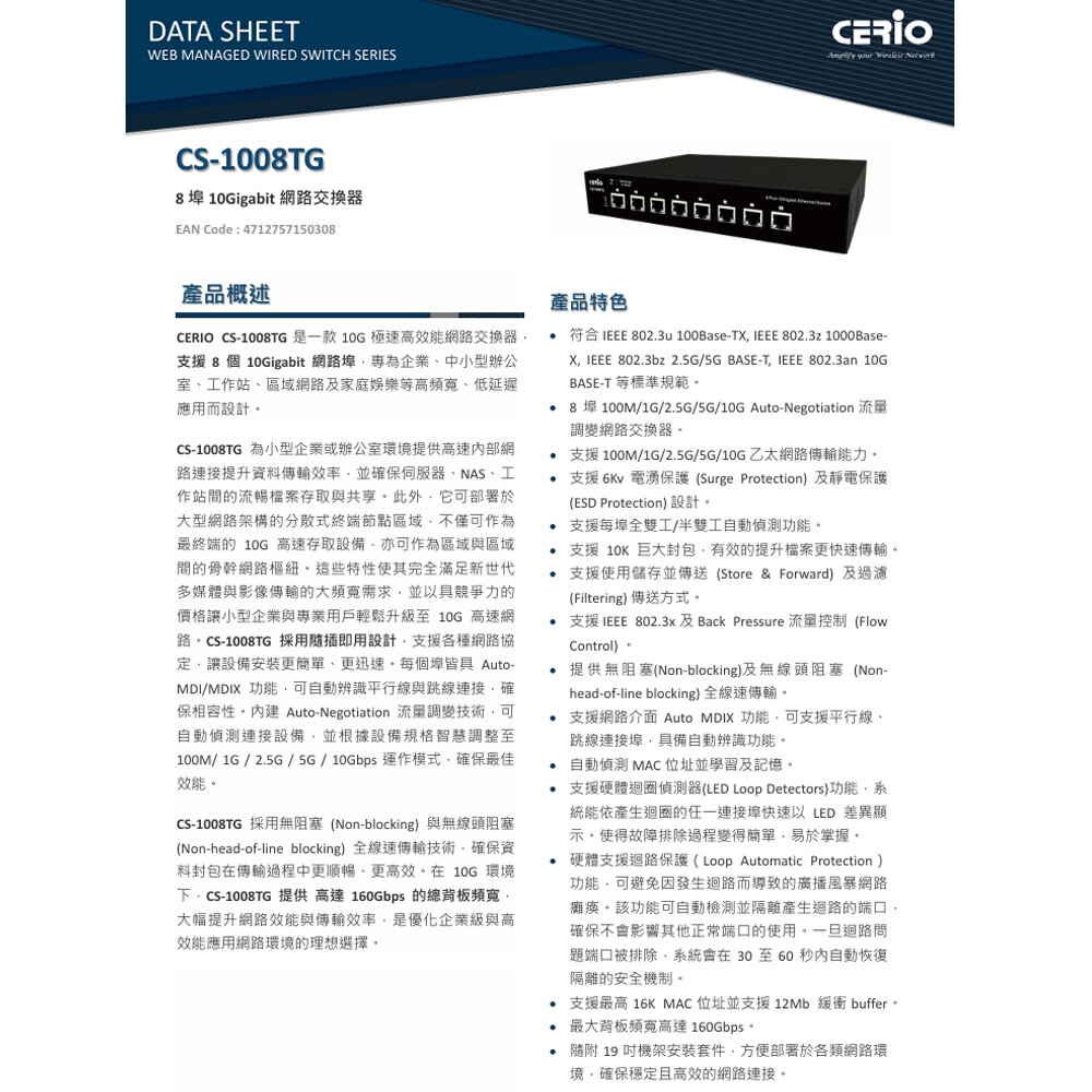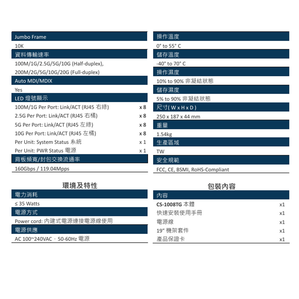 -符合IEEE 802.3u 100Base-TX, IEEE 802.3z 1000Base-X, IEEE 802.3bz 2.5G/5G BASE-T, IEEE 802.3an 10G BASE-T等標準規範。