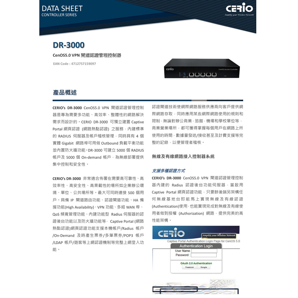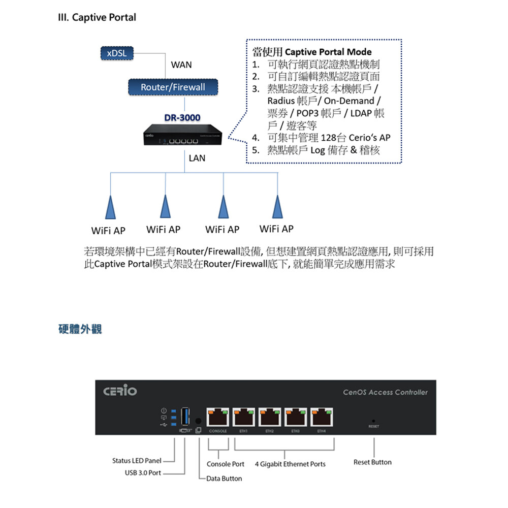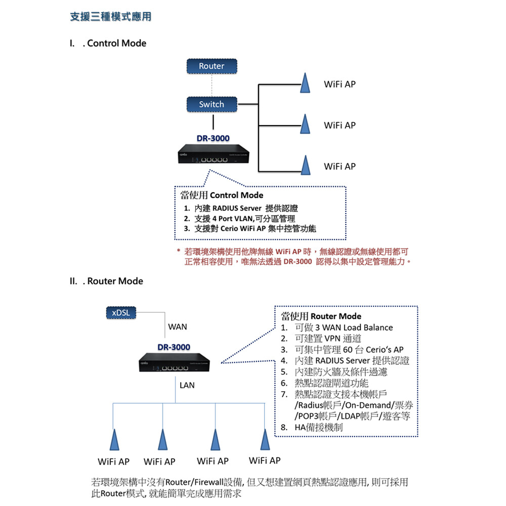 支援環境架構佈建無線基地台環境,相容於任何無線基地台,透過上端DR-3000 的建置使用,串接架構於下端的有線交換器使用者或無線AP存取使用者,皆可輕鬆架構認證登入的安全環境。