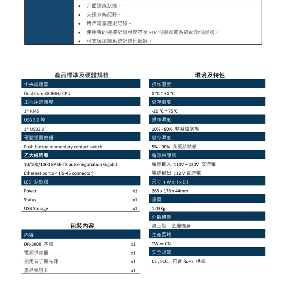 DR-3000內建基於策略性的DoS防火牆保護,以防止駭客攻擊,提高網路的安全性。