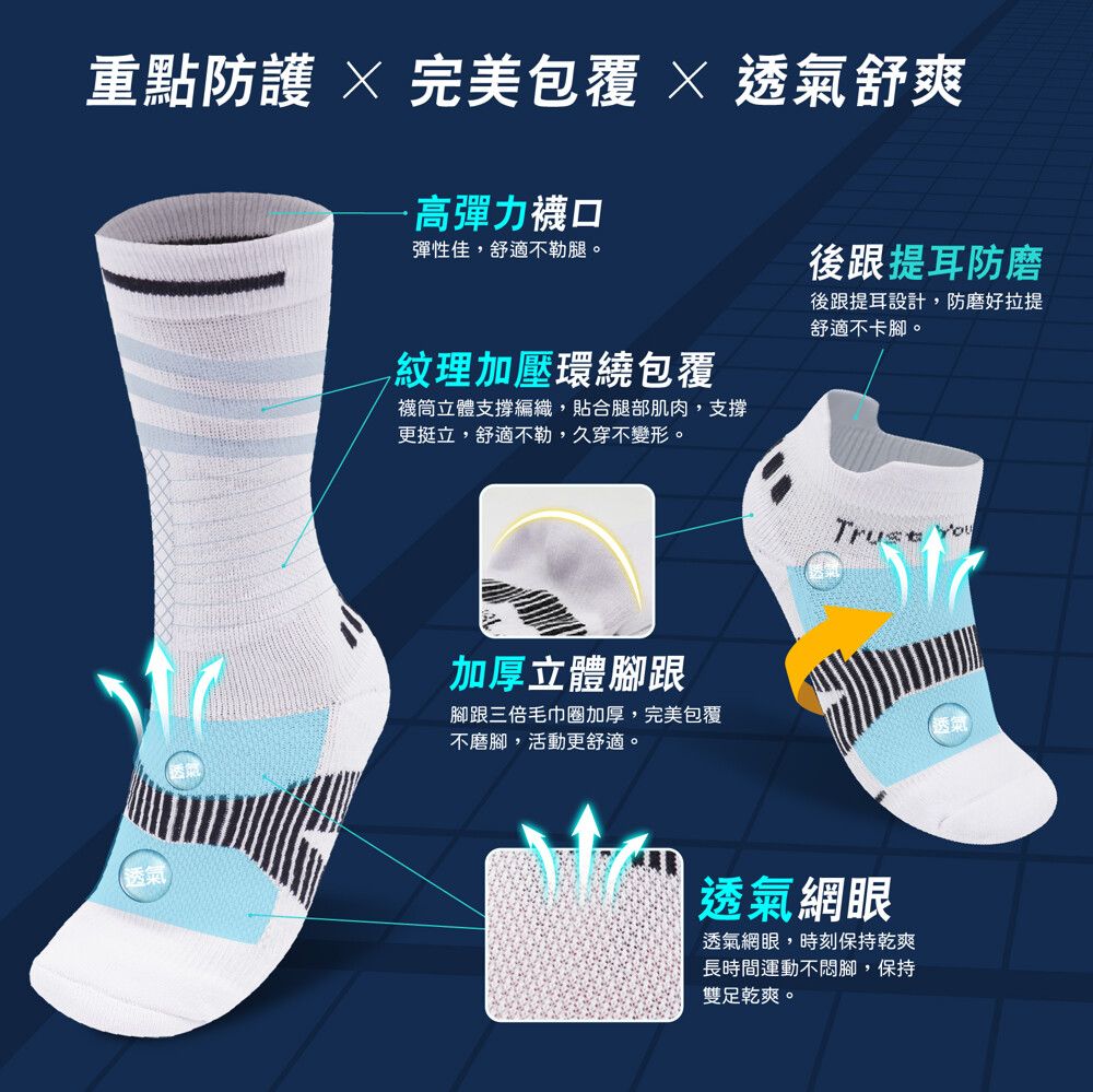 ► 襪筒紋理加壓結構+紋理毛圈加厚,讓襪筒更挺立,包覆更穩固。