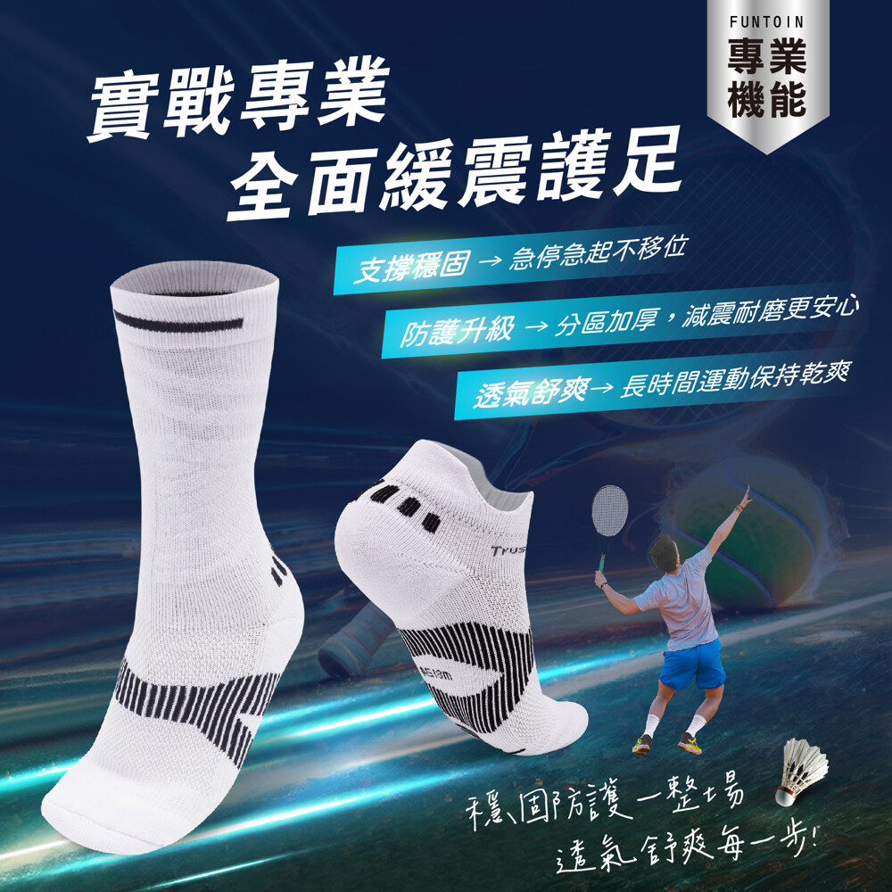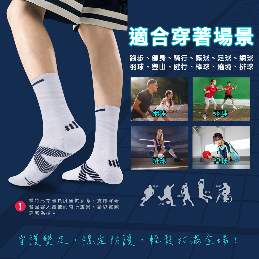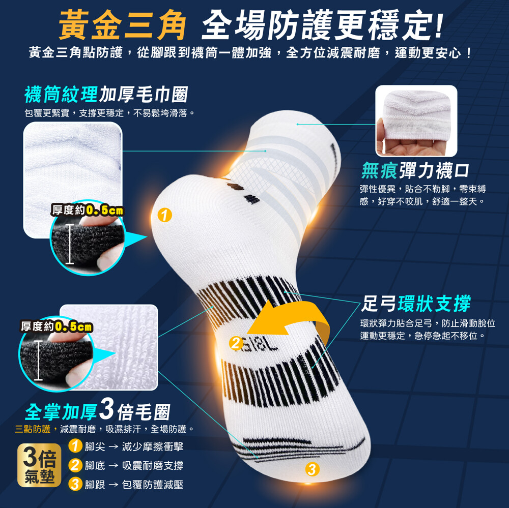 ► 足底三倍毛圈加厚,耐磨緩震,全面守護足底。