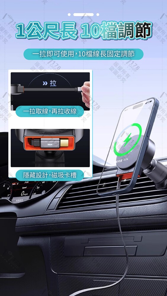 內建 伸縮線設計,線材隨拉隨收不卡位,搭配 雙吸磁環牢固吸附,無論顛簸路面還是急轉彎,都能穩穩充電不掉落。