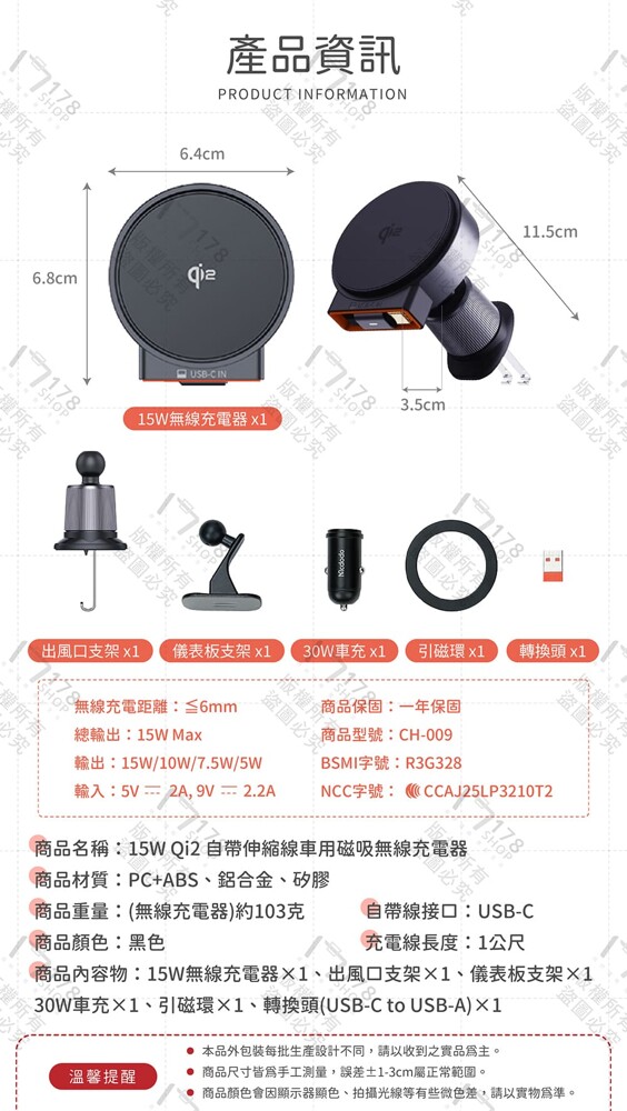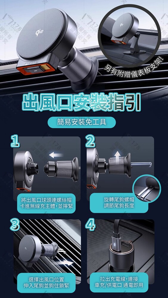 15W 無線充電器 x1、出風口支架 x1、儀表板支架 x1