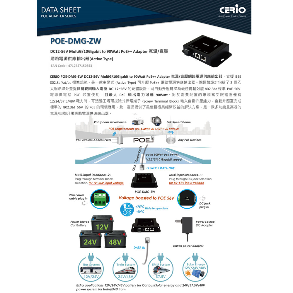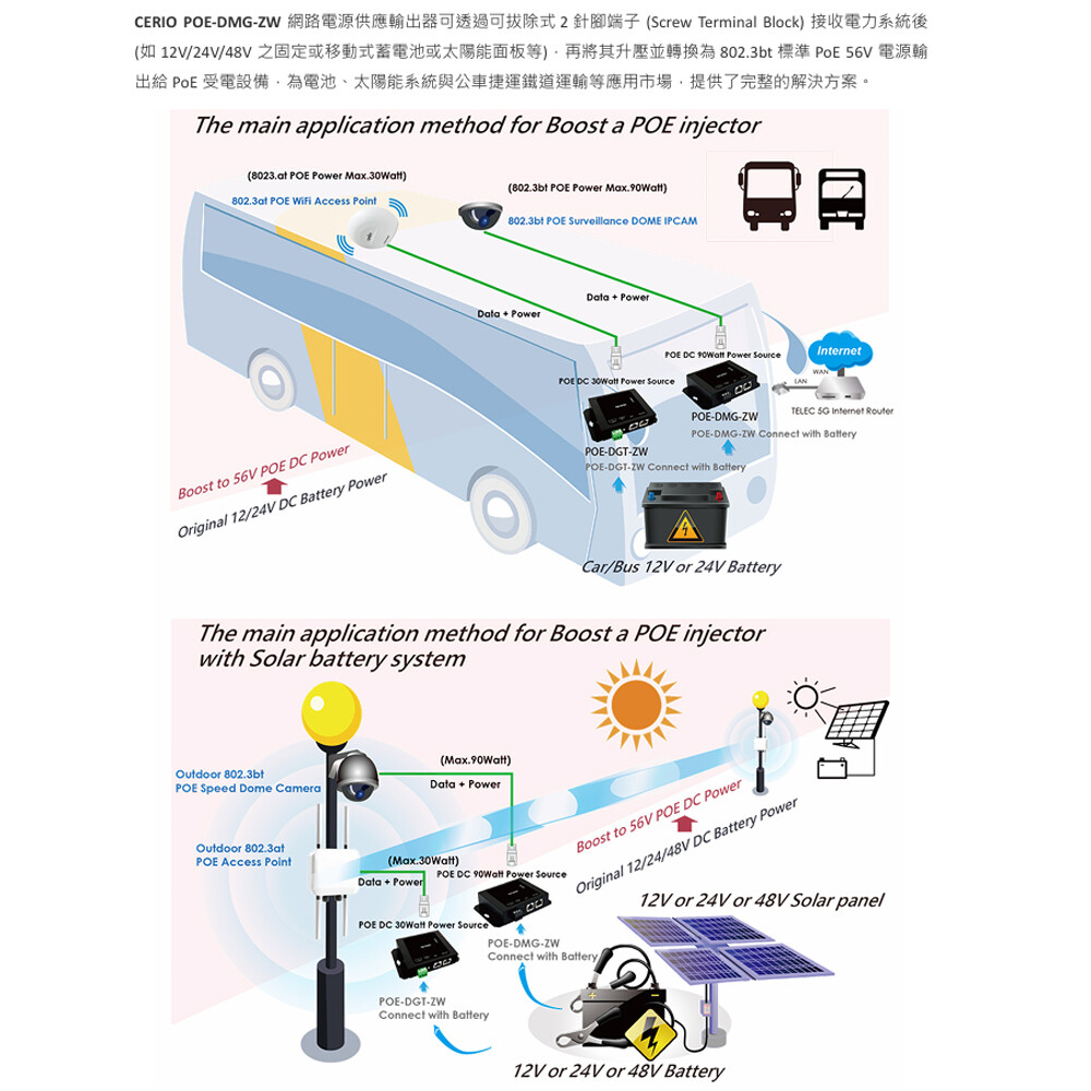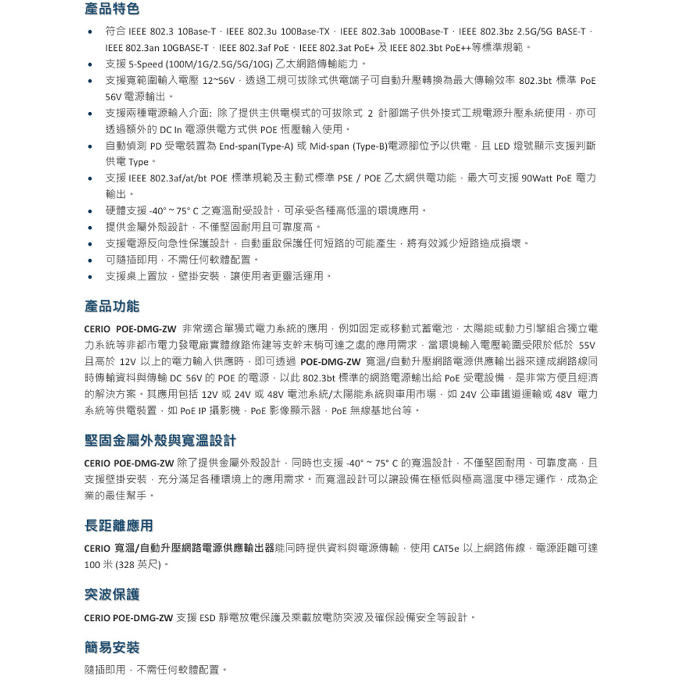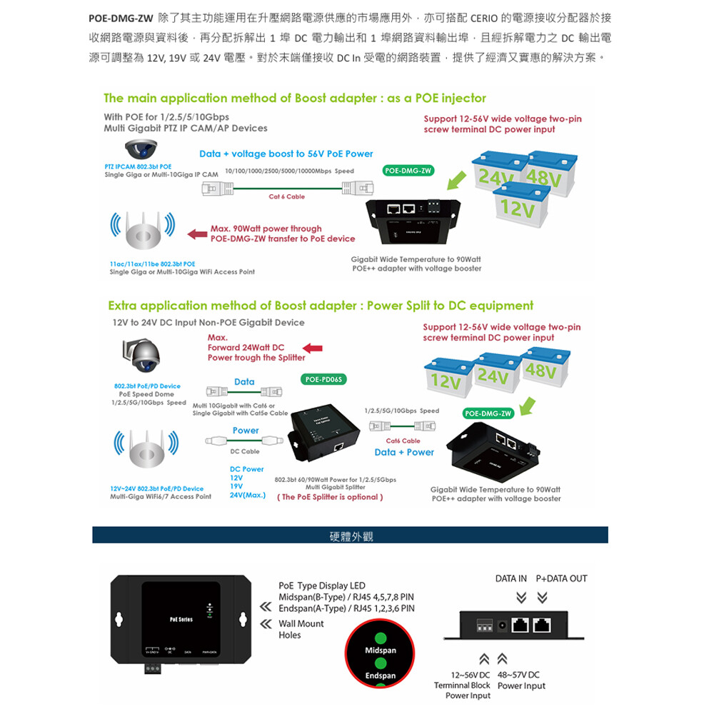 • 支援寬範圍輸入電壓12~56V,透過工規可拔除式供電端子可自動升壓轉換為最大傳輸效率802.3bt標準PoE 56V 電源輸出。