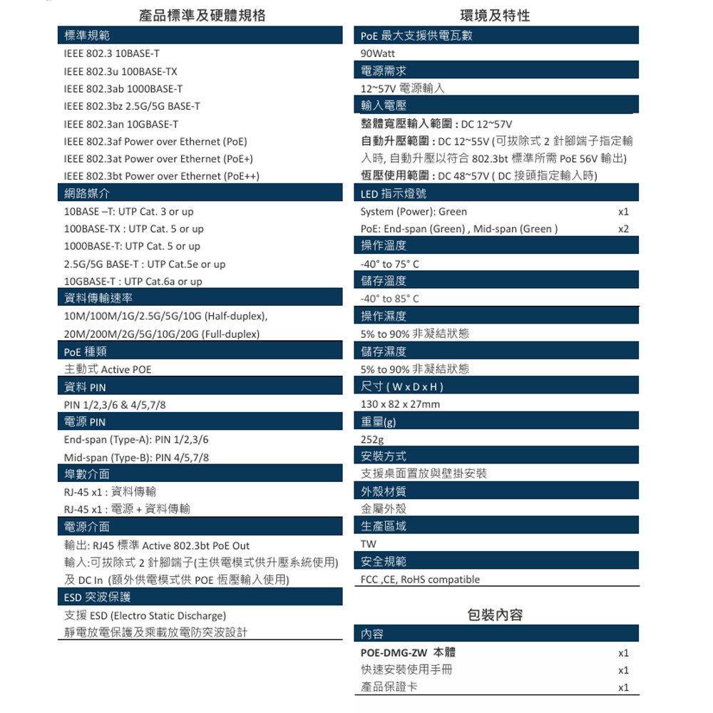 • 支援IEEE 802.3af/at/bt POE 標準規範及主動式標準PSE / POE乙太網供電功能,最大可支援90Watt PoE 電力輸出。