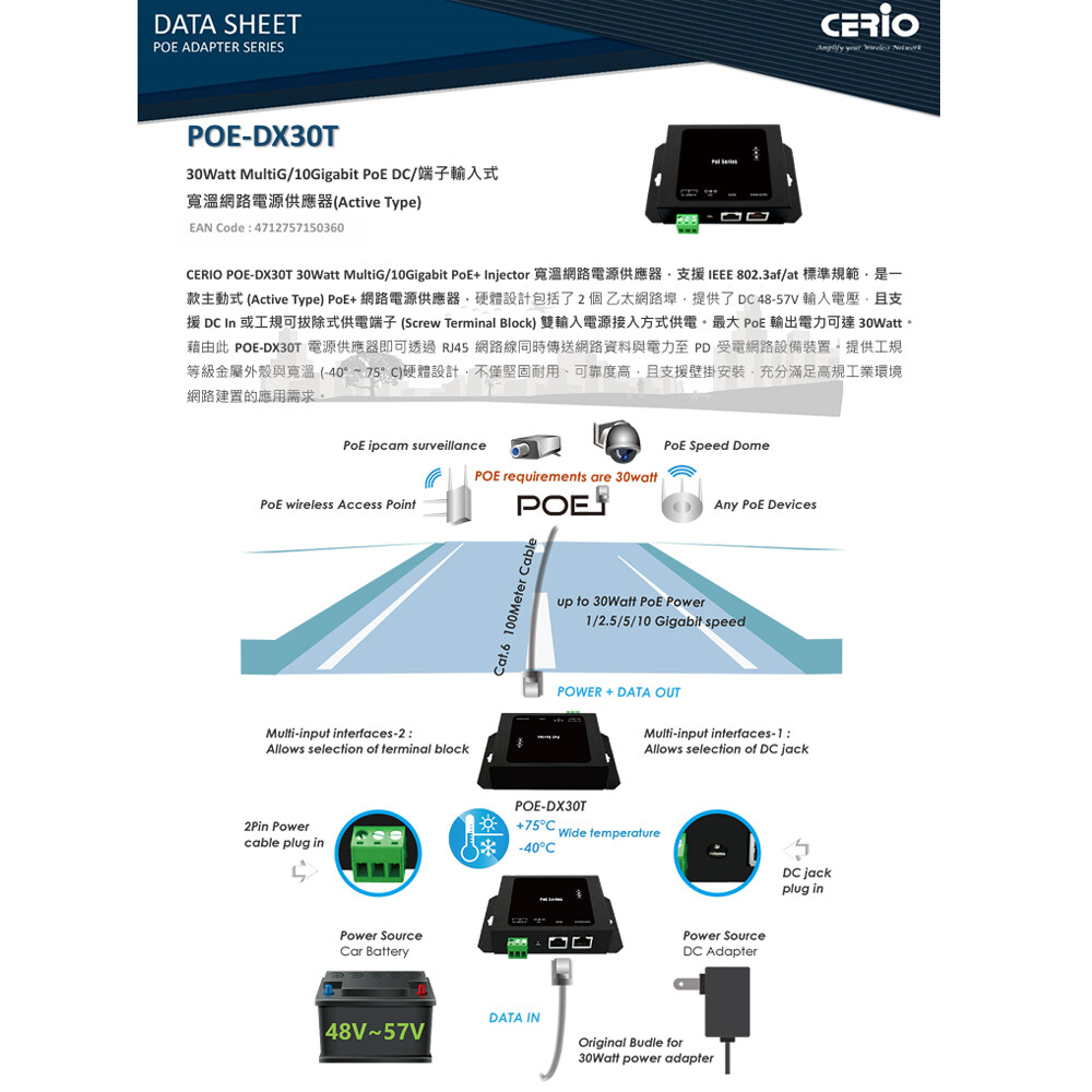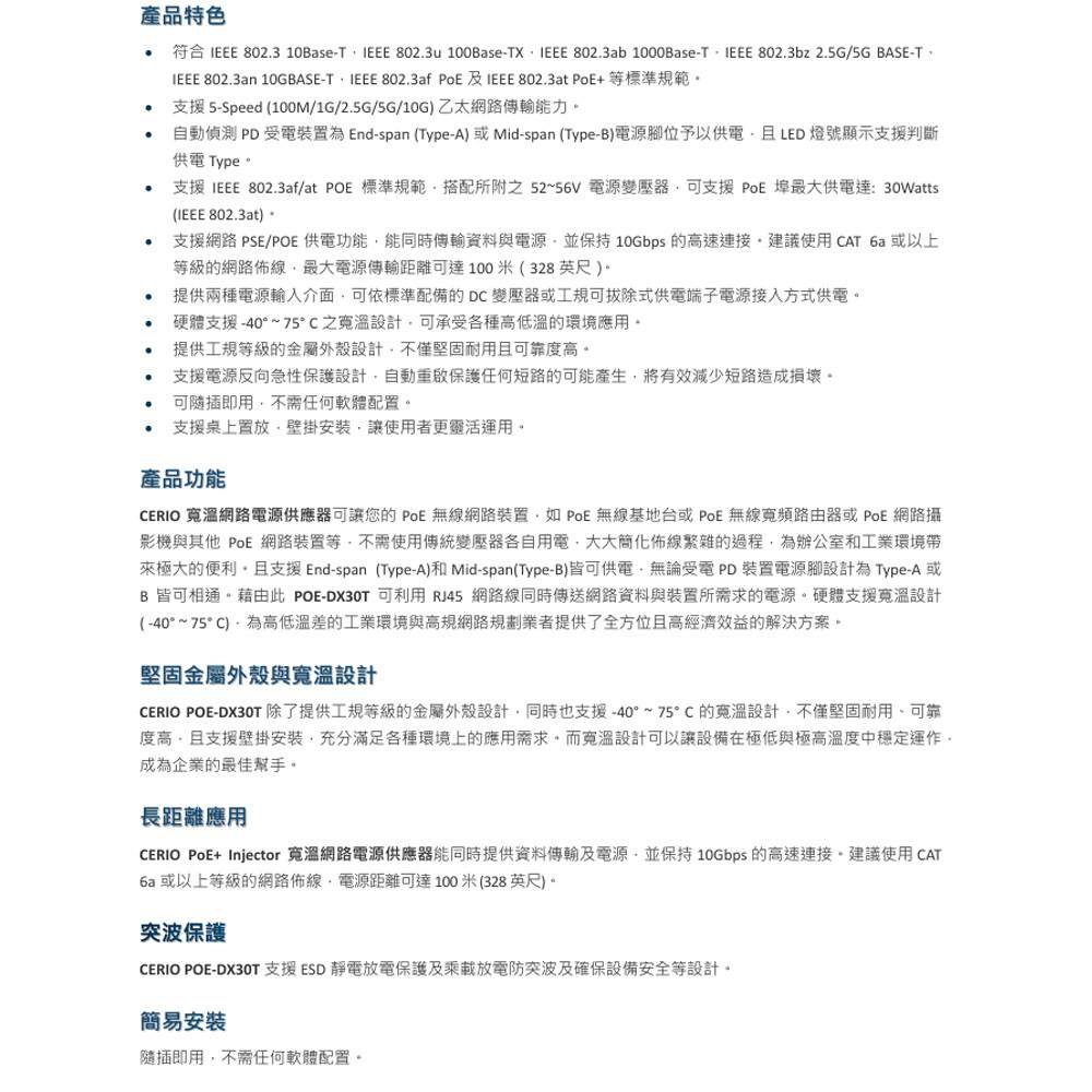 • 支援IEEE 802.3af/at POE 標準規範,搭配所附之52~56V電源變壓器,可支援PoE埠最大供電達: 30Watts (IEEE 802.3at)。