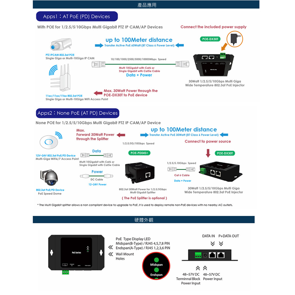 • 自動偵測 PD受電裝置為End-span (Type-A) 或Mid-span (Type-B)電源腳位予以供電,且LED 燈號顯示支援判斷供電Type。