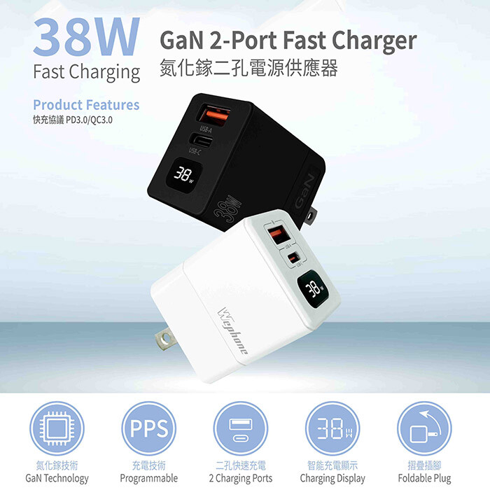 ◎ 38W 氮化鎵GaN 電源供應器, 使用「氮化鎵」科技,體積更小,充電快、發熱量低
