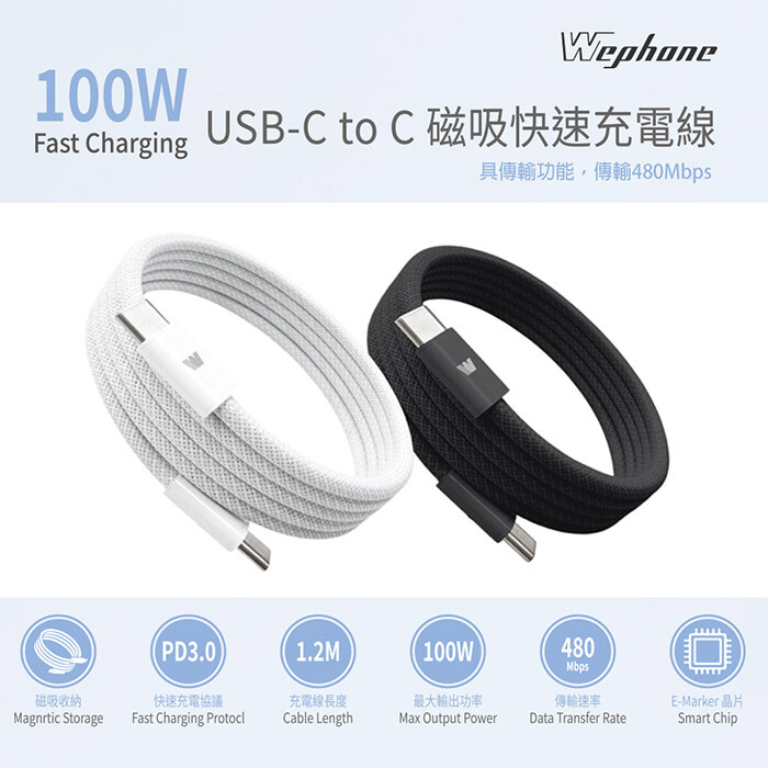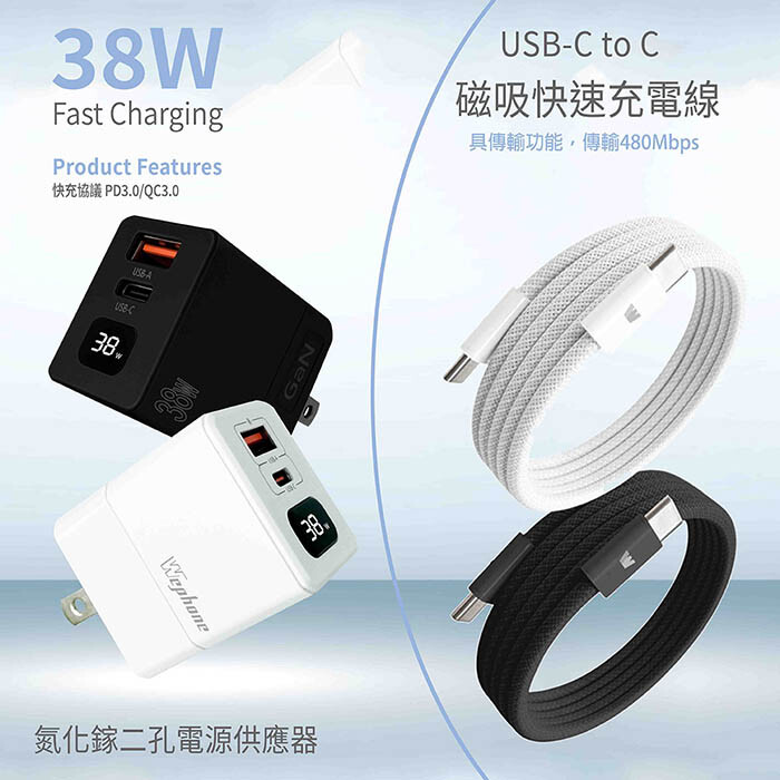 Wephone 38W氮化鎵 數字顯示雙孔充電器+雙頭Type-C 磁吸收納快充線(120公分)