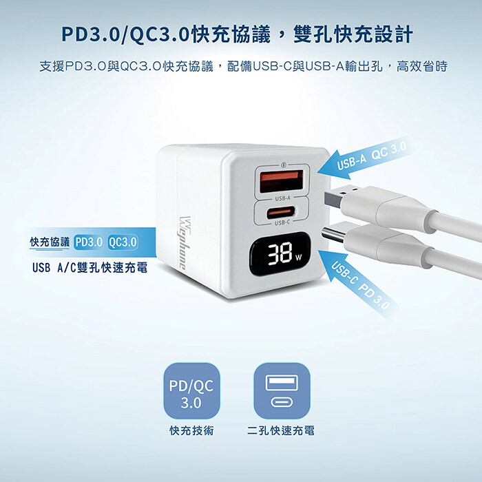產品名稱:氮化鎵38W二孔快速電源供應器
