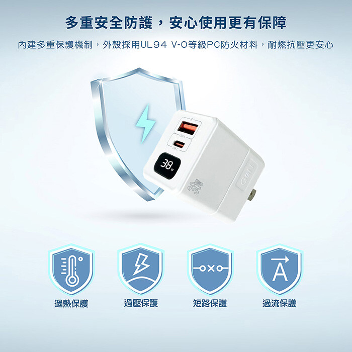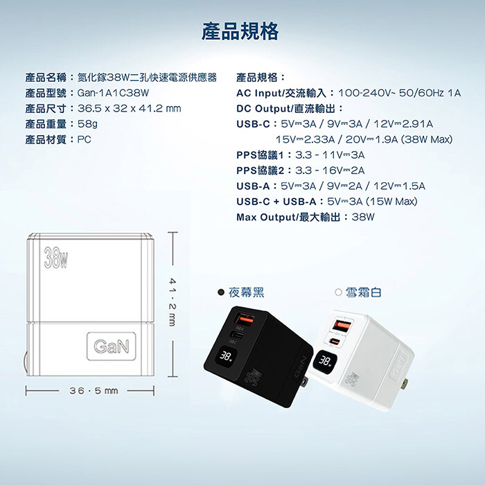 產品名稱:氮化鎵38W二孔快速電源供應器