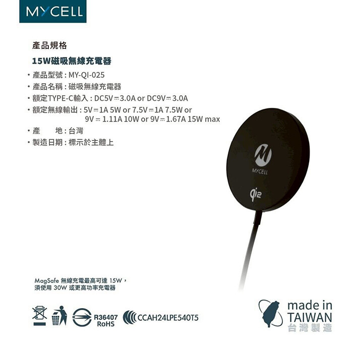 【MYCELL】台灣製造 Qi2認證 15W磁吸式無線充電器
