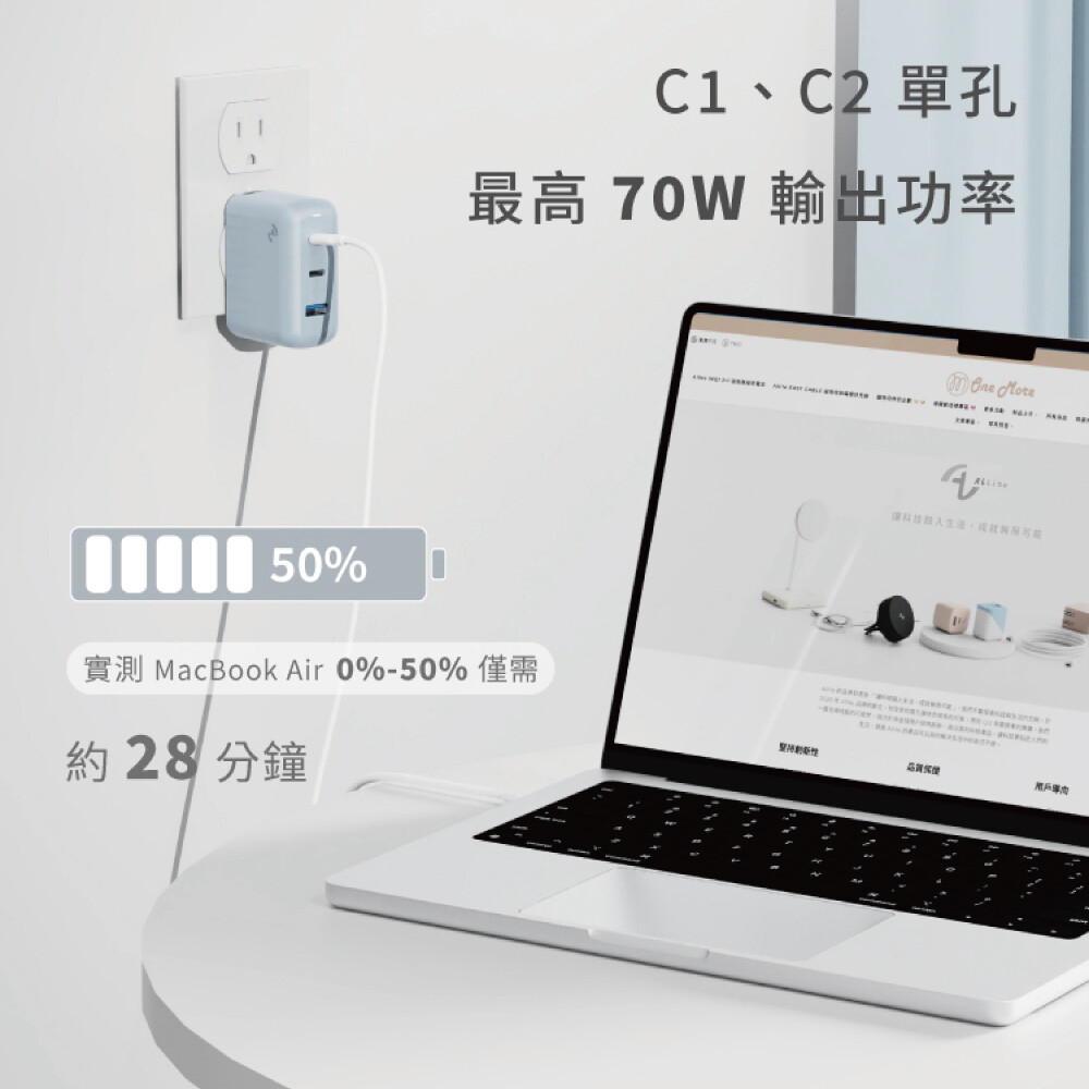 ●1A+2C三孔輸出,智能分配功率,多設備同時高效供電,單孔最高70W!