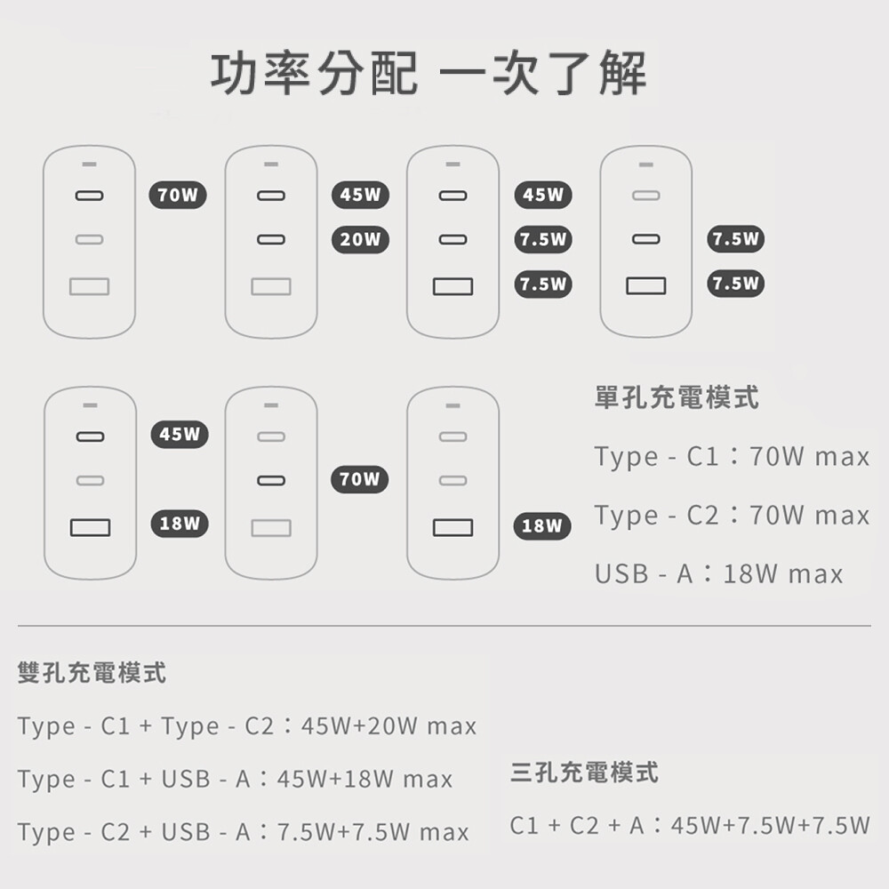 ●Type-C1+C2+USB-A輸出:45W+7.5W+7.5W