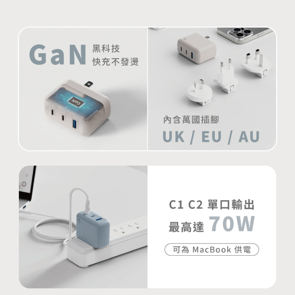●品名:A1 PRO 70W 1A+2C氮化鎵三孔快充充電器