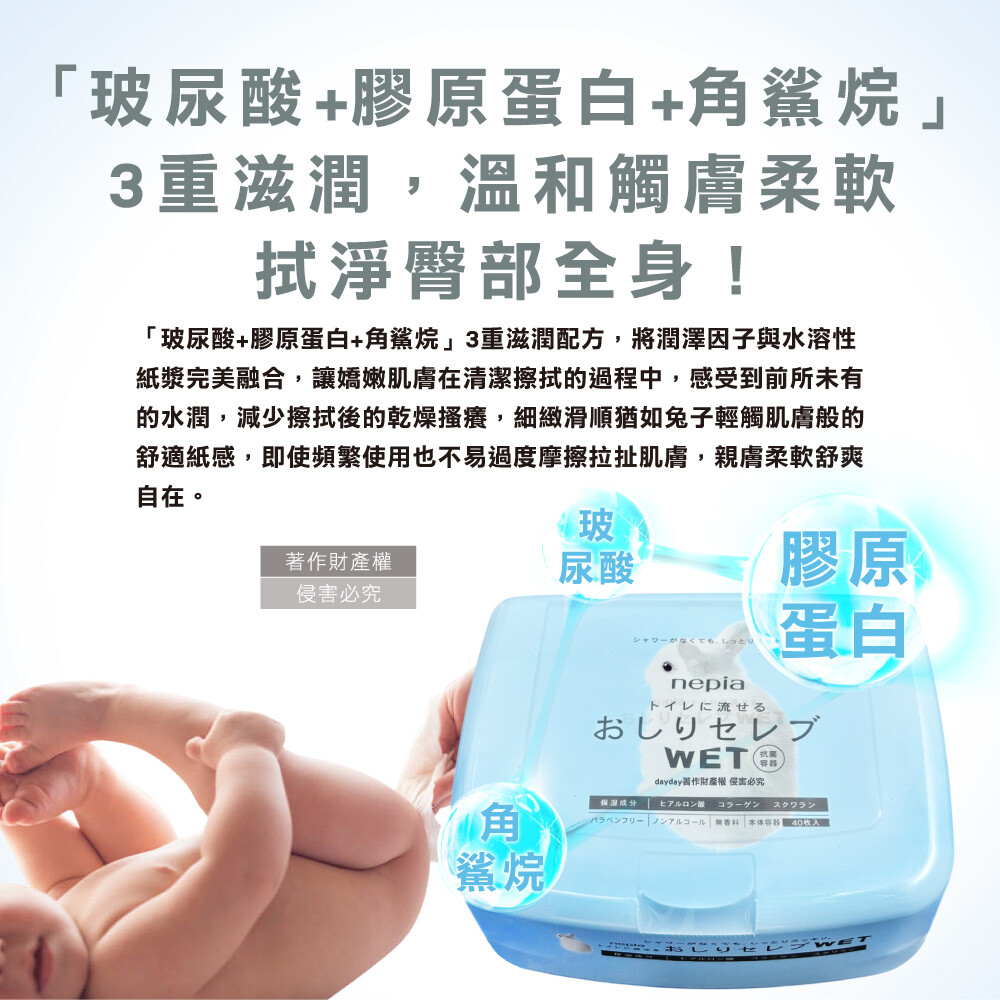●「玻尿酸+膠原蛋白+角鯊烷」3重滋潤,溫和觸膚柔軟,拭淨臀部全身!