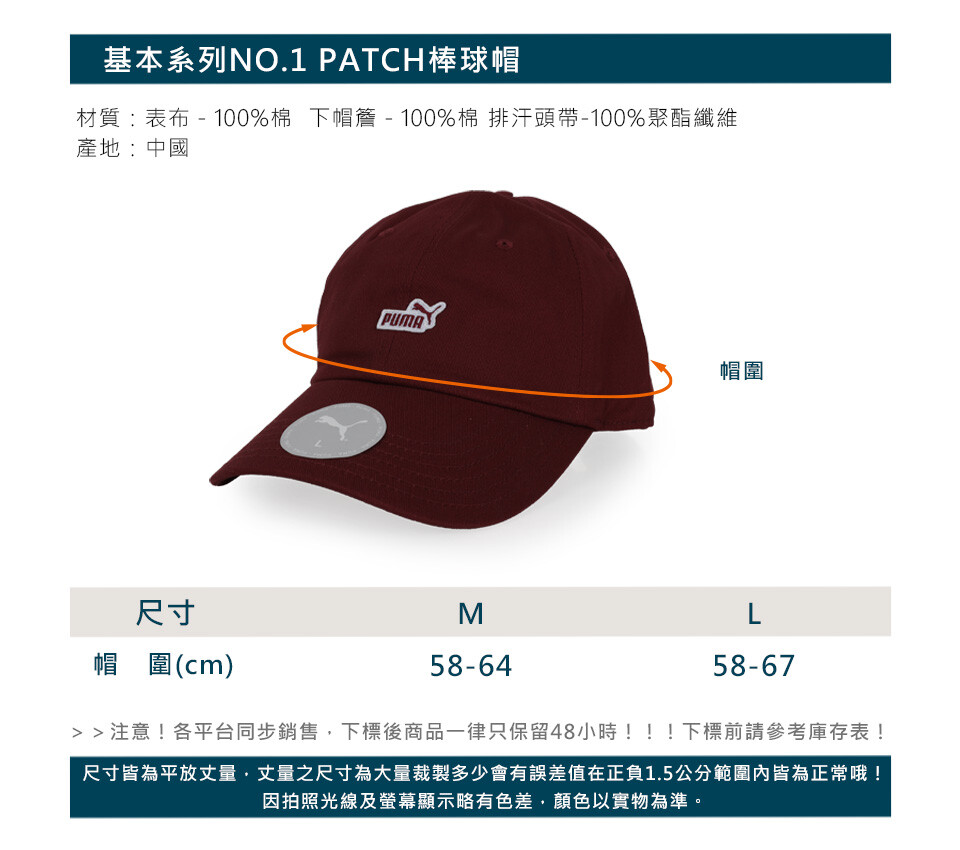 PUMA 基本系列NO.1 PATCH棒球帽-防曬 遮陽 棒球帽 運動 帽子 酒紅白