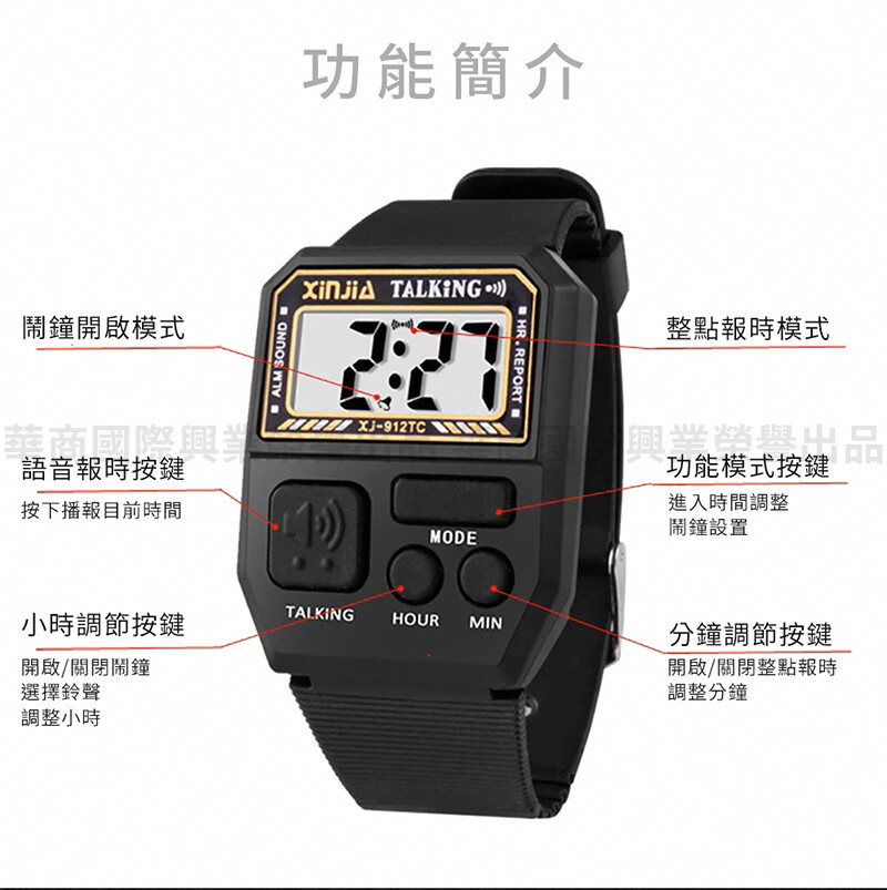 功能:語音報時,整點報時、鬧鐘、貪睡、6種鈴聲、12小時制