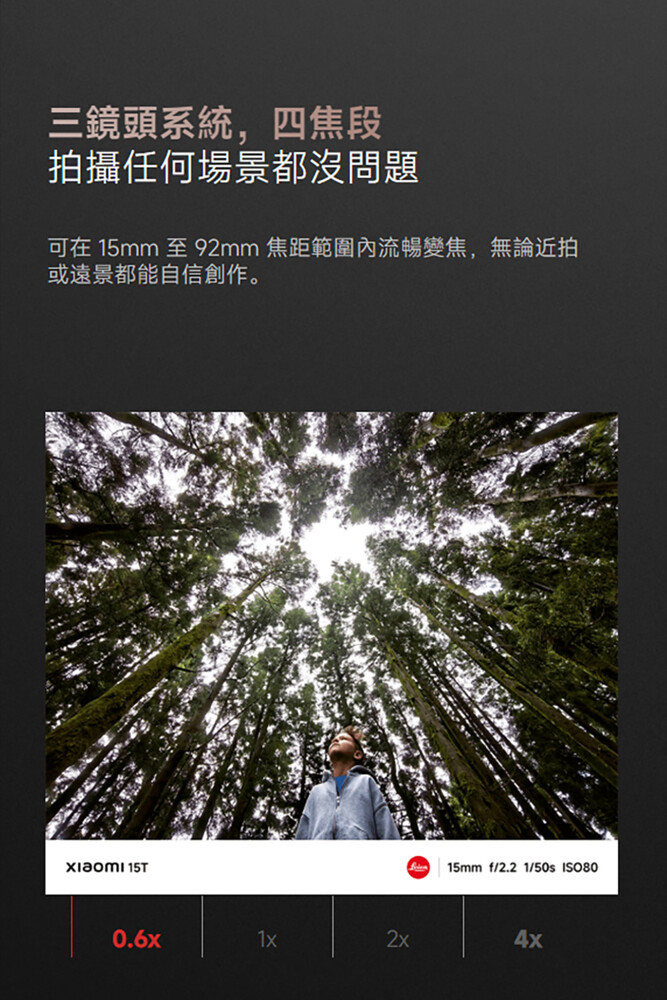 Xiaomi 15T 後置 5,000 萬畫素徠卡廣角主鏡頭 + 1,200 萬畫素徠卡超廣角鏡頭 + 5,000 萬畫素徠卡長焦鏡頭,主鏡頭採用光影獵人 800 感光元件。錄影方面,三鏡頭亦支援全焦段 4K 30fps HDR10+ 錄影,進一步提供 4K 60fps 10-bit Log 影片錄製、LUT 色彩描述檔匯入,確保每個瞬間都能細膩呈現。搭配內建的 AI 圖片編輯、AI 人像與 AI 剪輯等工具,讓使用者不論是拍攝或後製,都能輕鬆創作高品質影像作品。
