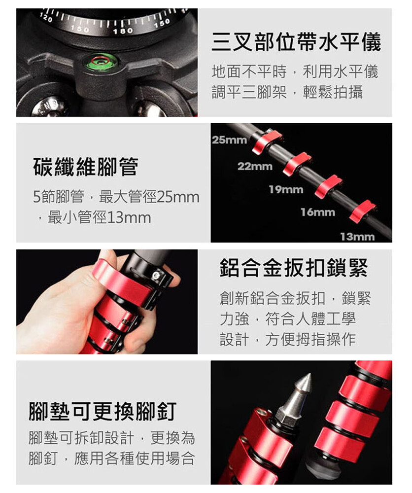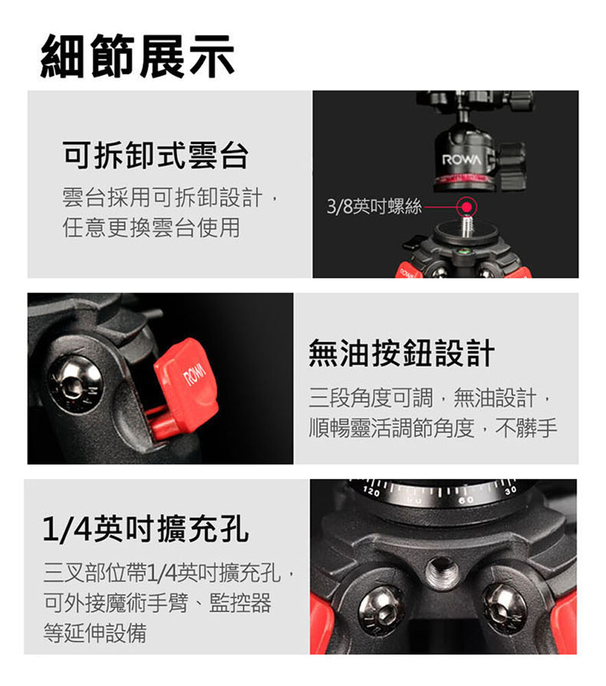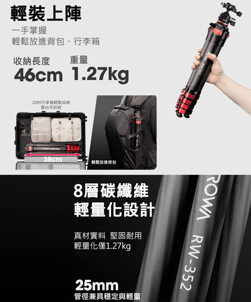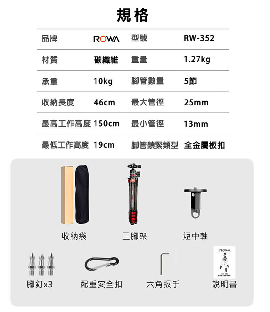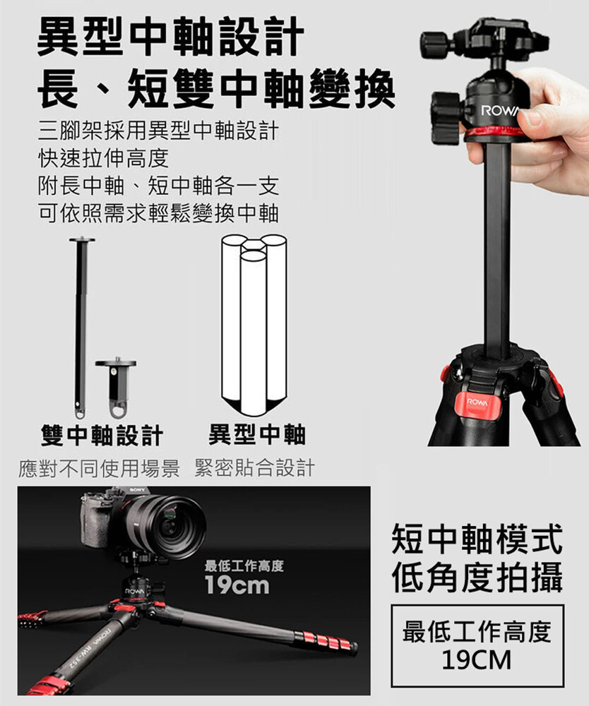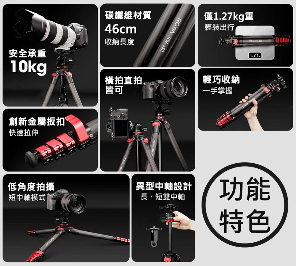 【僅1.27KG】【ROWA 樂華】RW-352 碳纖維扣板三腳架 攝影腳架 低角度拍攝 中軸